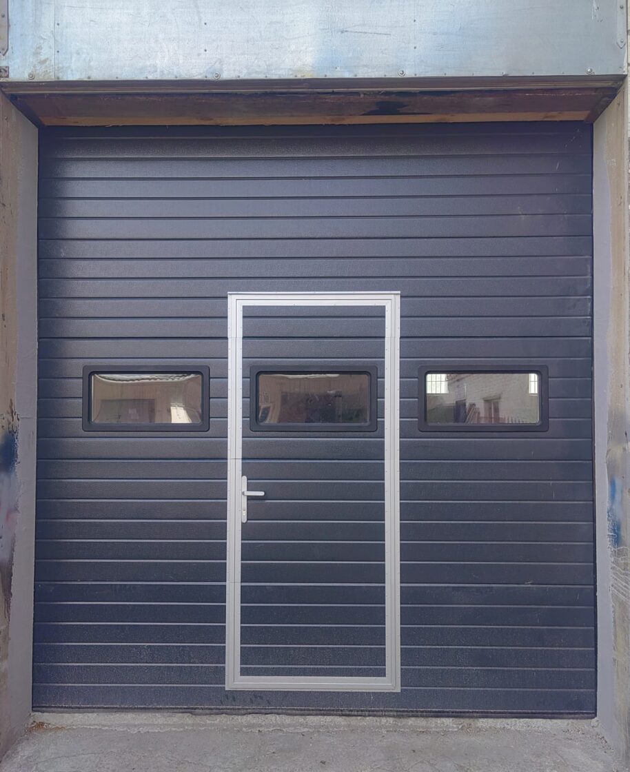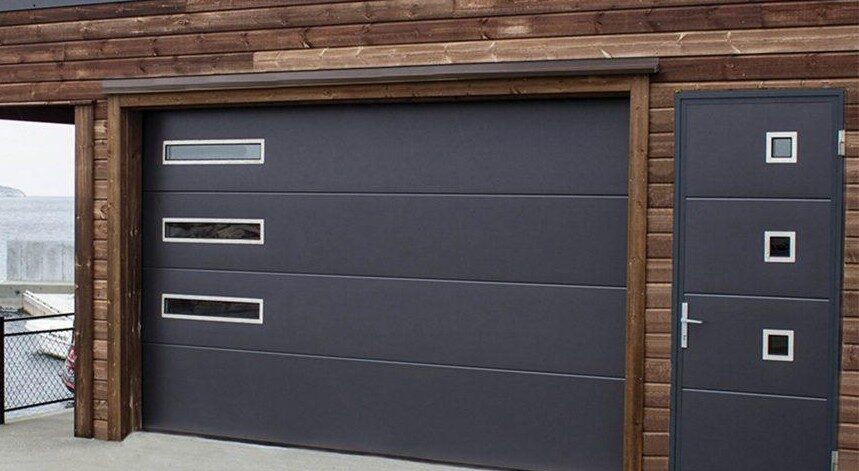 Atbilstošs dizains. Pilnīgi atbilstošas sānu durvis un garāžu vārtu dizains. -